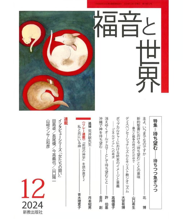 特集 待ち望む──待ちつつ急ぎつつ 主よ、いつまでなのですか …..北博 新約聖書における「待ち望む」ことの意味 ──暴力と戦争の時代のただ中で…..山口希生 ディスペンセーショナリズムとキリスト教シオニズム……大宮有博 ポップカルチャーにおける終末のイメージと意義 ──「エネルゲイア」への希求……高橋優子 消えゆくオールドカマーとして待ち望むこと…..許伯基 沖縄で神を待ち望む……金井創 追悼 荒井献先生……月本昭男 《リレー連載 『荊冠の神学』を読み直す2》 私と共にいる神……青木理恵子 【連載】 八木重吉の聖書——遺された〈書き入れ〉を読む17 エペソ書に見える書き入れ(上)……今高義也 私は告白する、私の神を21 自分を映し出す鏡としての聖性──アイザック・B・シンガー……長尾優 インタビューシリーズ 女たちの闘い——声をつむぐ、織りなす7 地域に生きる──北九州「聖書と女性」読書会……大嶋果織・工藤万里江・堀江有里・渡邊さゆり 証言としての旧約聖書8 カナンにおける「イスラエル」——アウトローたちの神……田島卓 「日本的キリスト教」を読む32 三浦清一『日本精神への理解と十字架の福音』(一九四〇年)……山口陽一 新約釈義 ルカ福音書36 2 : 41 − 52……山﨑ランサム和彦 表紙画……八木美穂子